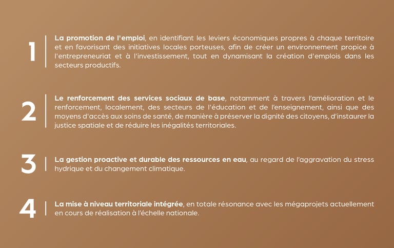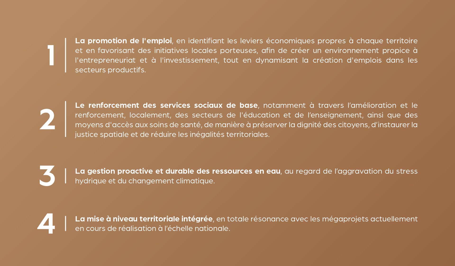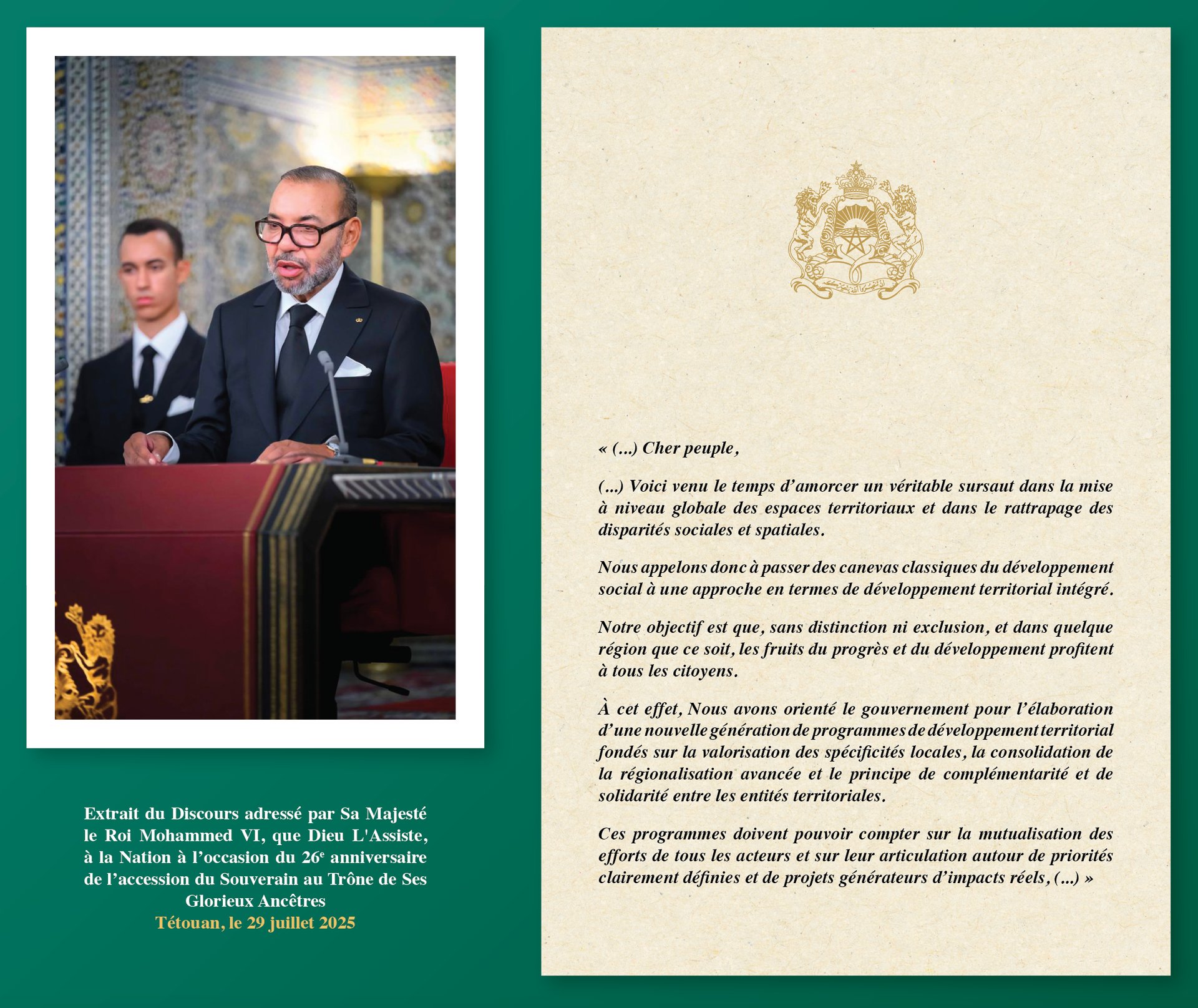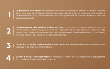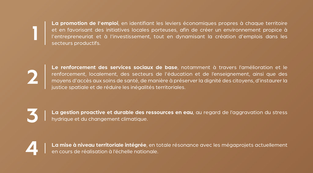 S’inscrivant dans le cadre des Hautes Orientations Royales, la nouvelle génération de programmes de développement territorial intégré traduit une volonté ferme de replacer l’action publique au plus près des attentes des citoyens. Dans la continuité des grands chantiers du Nouveau Modèle de Développement et de la généralisation de la protection sociale, cette priorité souveraine invite à penser le développement à partir des territoires eux-mêmes.