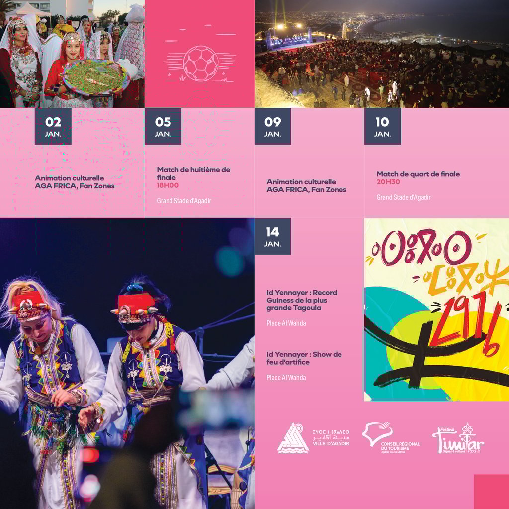 Cette année, la ville d’Agadir aura le plaisir de partager son identité amazighe avec les supporters de la CAN 2025 à l’occasion du Nouvel An Amazigh, Id Yennayer 2976. De belles festivités mettant en lumière les spécificités culturelles seront organisées dans les lieux emblématiques de la ville : la Kasbah d’Agadir Oufella, la corniche du front de mer, le Jardin Ibn Zaïdoun et les places publiques. Au programme : soirées artistiques, projections cinématographiques et dégustations de spécialités amazighes qui raviront les participants.