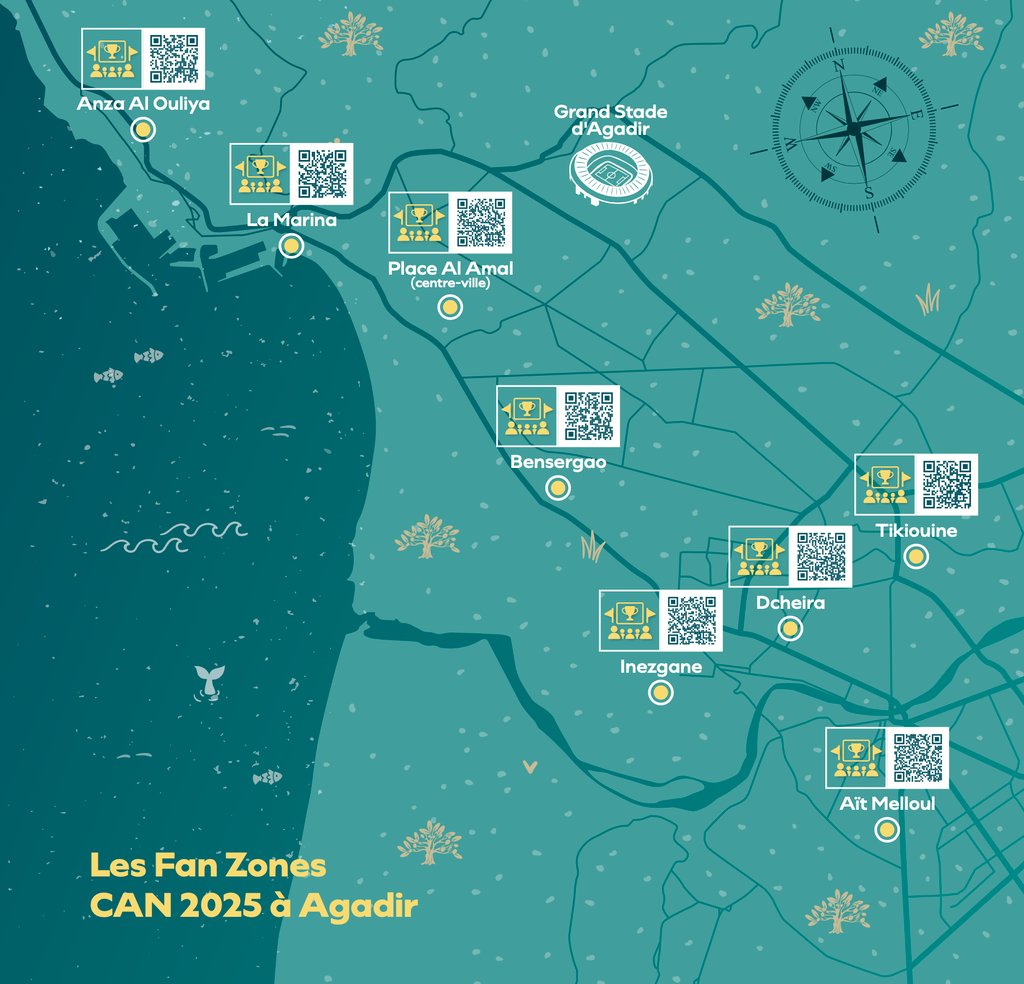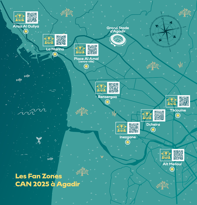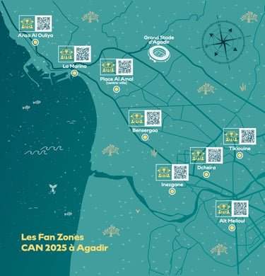Pour que tous les passionnés de football puissent vivre la CAN comme s’ils étaient au stade, le centre-ville et plusieurs quartiers d’Agadir accueilleront des fan zones festives et accessibles à tous. Écrans géants, animations culturelles, musique et points de restauration viendront compléter l’expérience pour offrir une ambiance unique et conviviale aux supporters. Dès le 21 décembre, choisissez votre fan zone et préparez-vous à vivre chaque rencontre comme un véritable événement collectif.