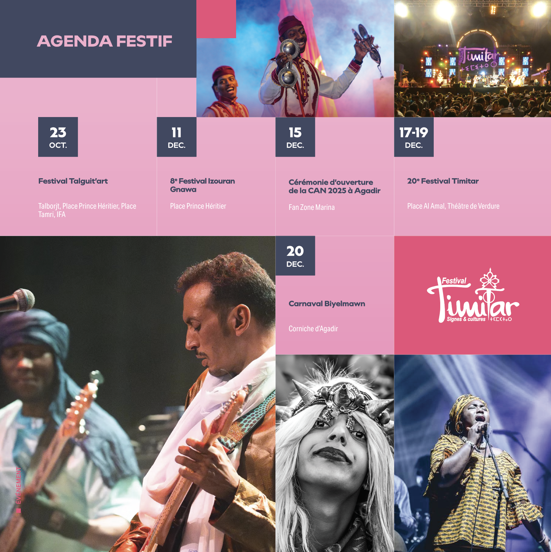 Dans une ambiance exceptionnelle marquée par la Coupe d’Afrique des Nations 2025, le Festival Izouran Gnawa revient du 11 au 14 décembre sur la Place Prince Héritier. Organisé par l’Association Gnawa Souss pour la créativité, l’art et la culture populaire, cet événement met à l’honneur la richesse du patrimoine gnaoui, inscrit à l’UNESCO. Vivez une expérience artistique intense en présence de maâlems venus de toutes les régions du Maroc.