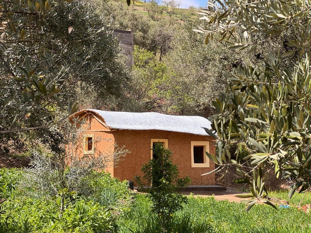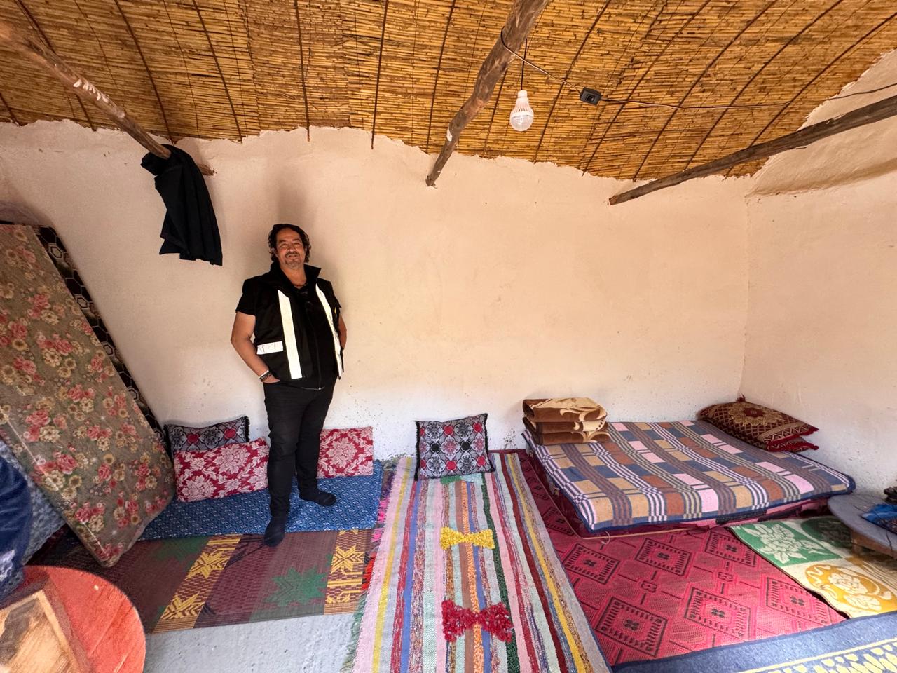 Intérieur de la Douira, construite par Amal Biladi après le séisme du 8 septembre 2023, Douar Ait Bourd, commune Amezmiz, Province Al Haouz 18m2 de superficie, 3 mètres de hauteur
